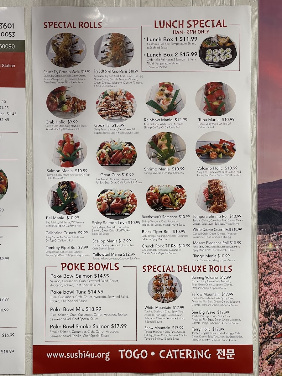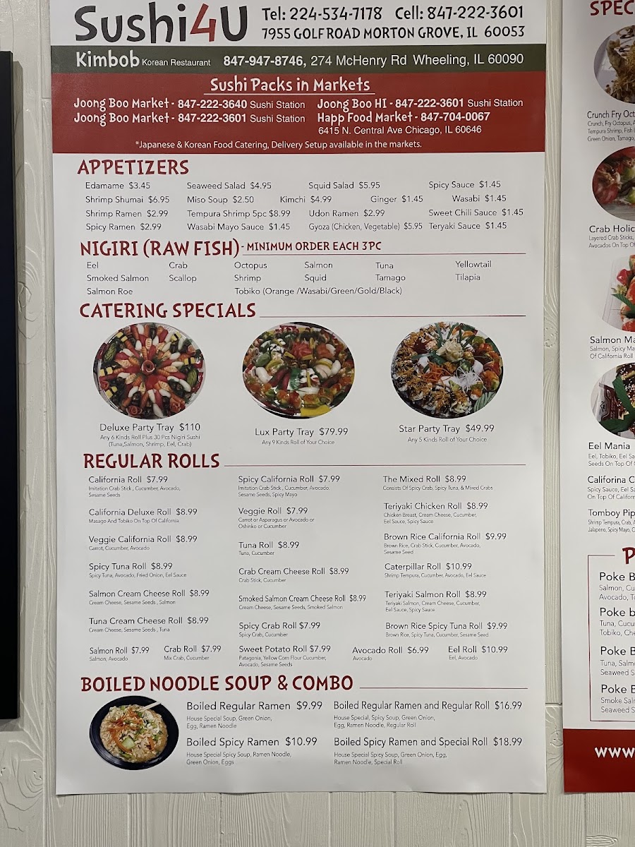 Kimbop Korean Sushi Fusion offers a diverse menu that blends Korean and sushi flavors seamlessly. For appetizers, they feature classics like Edamame, Shrimp Shumai, and Miso Soup, as well as more exciting choices such as Spicy Rice Cake Skewers and a refreshing House Salad. Their catering specials are ideal for larger gatherings, with options like the Deluxe Party Tray, Lux Party Tray, and Star Party Tray. The regular rolls include favorites like the California Roll, California Deluxe Roll, and Spicy California Roll, along with a variety of veggie options like the Veggie California Roll and Veggie Roll. For something more unique, their special rolls such as the California Crunch Roll, Godzilla Roll, Crab Holic, Rainbow Mania, and Salmon Mania stand out. The poke bowls, available in Salmon, Tuna, or a Mix of both, provide a fresh and customizable option. Ramen and udon lovers will enjoy the wide selection, including Miso Ramen, Spicy Miso Ramen, Chicken Ramen, Spicy Curry Ramen, and Tonkotsu Ramen. Additionally, their fried rice series offers savory choices like Veggie Fried Rice, Beef Fried Rice, Pork Fried Rice, Shrimp Fried Rice, and Chicken Fried Rice. With such an extensive and flavorful menu, Kimbop ensures there's something for every taste.